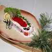 393/5/0.5/10/10/4/1 г • сельдь, свекла, морковь, картофель отварной, лук, яйцо, майонез, икра летучей рыбы, килька пряного посола, лимон, лавровый лист, маслины, салат, зелень, яйцо перепелиное